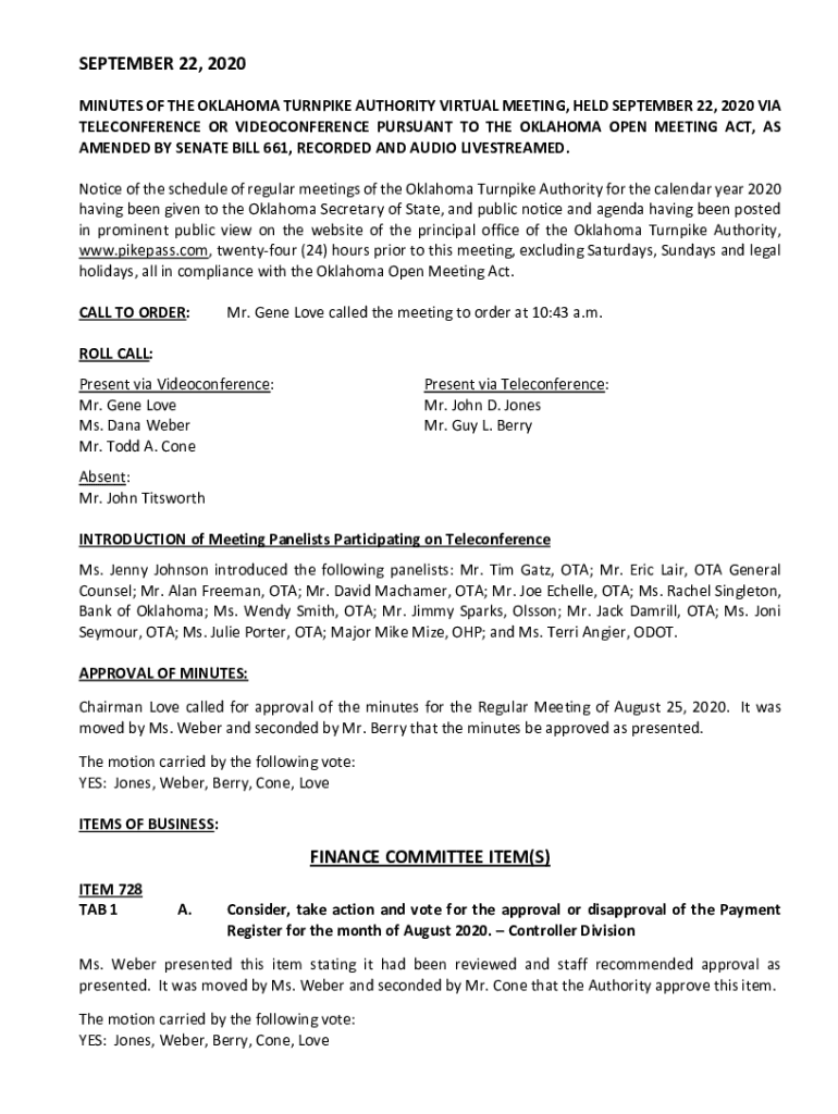 SEPTEMBER 22, 2020, MINUTES OF THE OKLAHOMA TURNPIKE AUTHORITY VIRTUAL MEETING, HELD SEPTEMBER 22, 2020, VIA TELECONFERENCE OR VIDEOCONFERENCE PURSUANT TO THE OKLAHOMA OPEN MEETING ACT, AS AMENDED