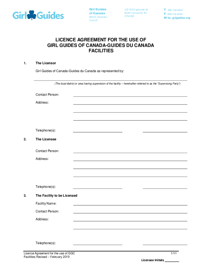 British Columbia Council107252 Esplanade W. North Vancouver, BC V7M 0E96047146636 6047146645LICENCE AGREEMENT FOR THE USE OF GIRL GUIDES OF CANADAGUIDES DU CANADA FACILITIES 1. The Licensor Girl Guides