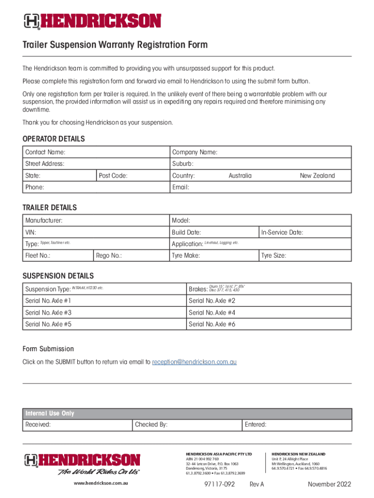 Trailer Suspension Warranty Registration Form The Hendrickson team is committed to providing you with unsurpassed support for this product. Please complete this registration form and forward via email