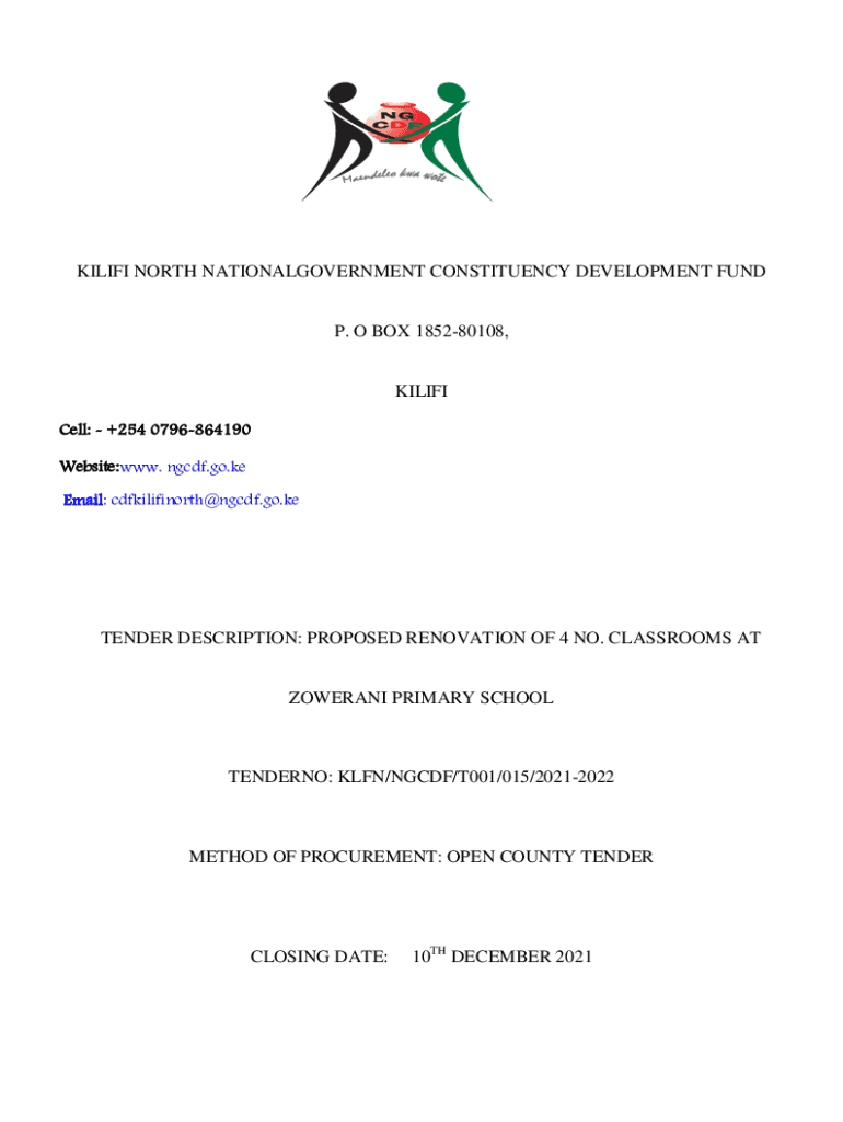 Email: cdfkilifinorth@ngcdf.go.keTENDER DESCRIPTION: PROPOSED RENOVATION