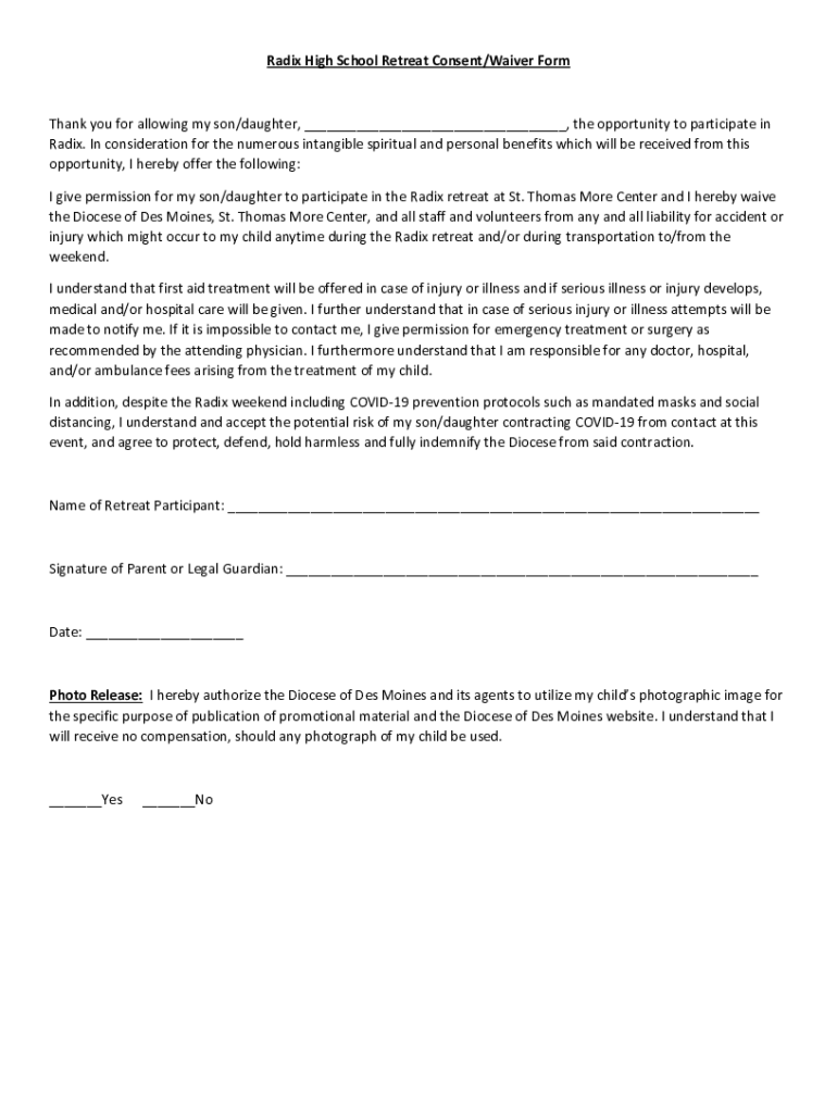 Radix High School Retreat Consent/Waiver Firsthand you for allowing my son/daughter, ___, the opportunity to participate in Radix. In consideration for the numerous intangible spiritual and personal