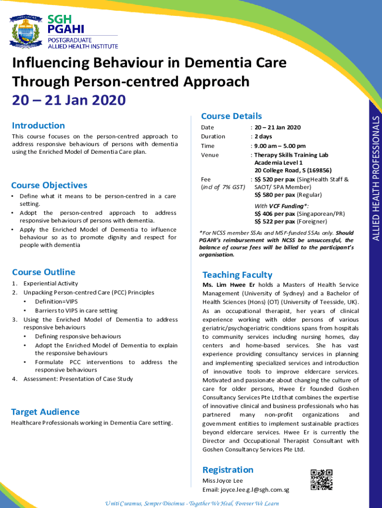 Course DetailsIntroduction This course focuses on the person-centered approach to address responsive behaviors of persons with dementia using the Enriched Model of Dementia Care plan. Course Objectives