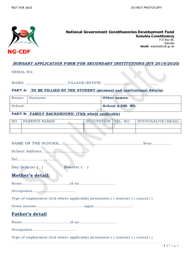 NOT FOR SALADO NOT PHOTOCOPYNational Government Constituencies Development Fund Suzuki Constituency P. O Box 86. Suzuki Email: subukia@cdf.go.keNGCDF BURSARY APPLICATION FORM FOR SECONDARY INSTITUTIONS