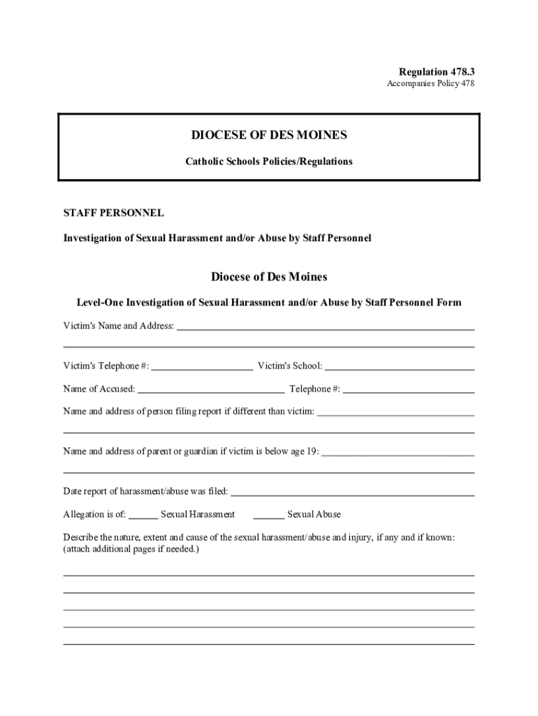 Regulation 478.3Accompanies Policy 478DIOCESE OF DES MOINES Catholic Schools Policies/RegulationsSTAFF PERSONNEL Investigation of Sexual Harassment and/or Abuse by Staff PersonnelDiocese of Des Moines