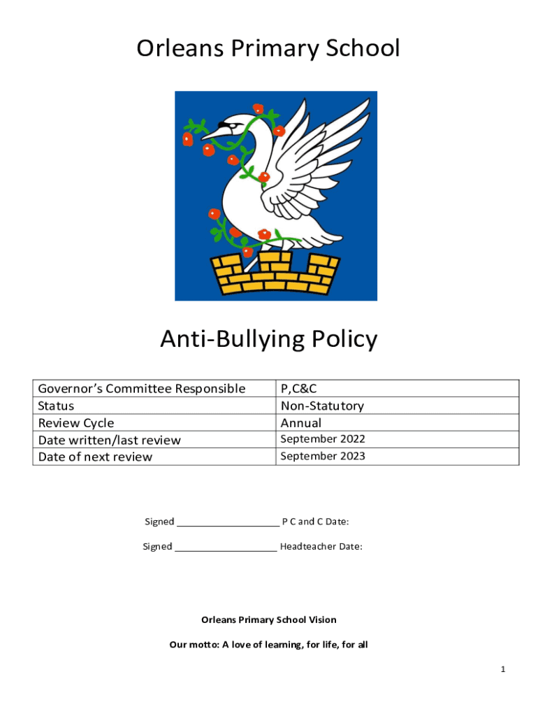 Orleans Primary SchoolAntiBullying Policy Governors Committee Responsible Status Review Cycle Date written/last review Date of next review, C&C Statutory Annual September 2022 September 2023Signed