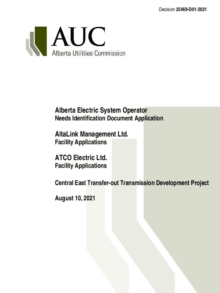 Decision 25469D012021Alberta Electric System OperatorNeeds Identification Document ApplicationAltaLink Management Ltd. Facility ApplicationsATCO Electric Ltd. Facility Applications Central East Transfer