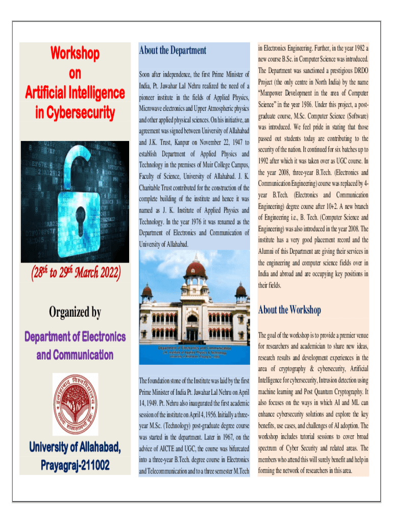 Workshop on Artificial Intelligence in CybersecurityAbout the Department Soon after independence, the first Prime Minister of India, Pt. Jaguar Law Nehru realized the need of a pioneer institute in