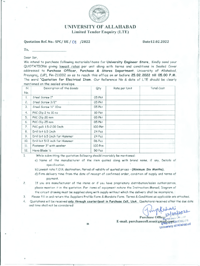 9,.1,IJ\'/.!()I\”\'UNIVERSITY ALLAHABADILimited Tender Inquiry (LTE)