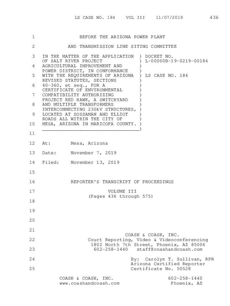 LS CASE NO. 184VOL III11/07/20191BEFORE THE ARIZONA POWER PLANT2AND TRANSMISSION LINE SITING COMMITTEE3 4 5 6 7 8 9 10436IN THE MATTER OF THE APPLICATION) DOCKET NO. OF SALT RIVER PROJECT) L00000B19021900184