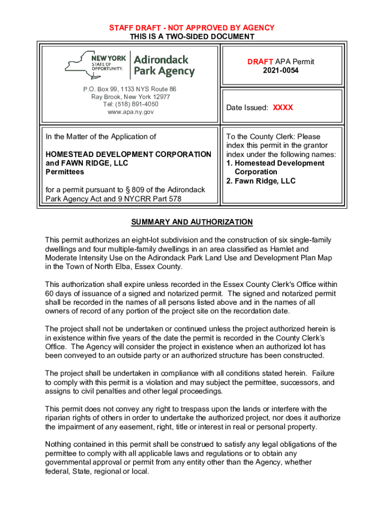 STAFF DRAFT NOT APPROVED BY AGENCY THIS IS A PROVIDED DOCUMENT DRAFT APA Permit 20210054 P.O. Box 99, 1133 NYS Route 86 Ray Brook, New York 12977 Tel: (518) 8914050 www.apa.ny.govIn the Matter of