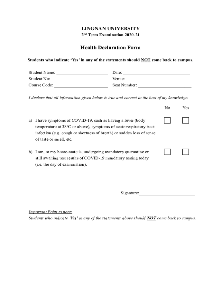 LINEMAN UNIVERSITY 2nd Term Examination 202021Health Declaration Form Students who indicate Yes in any of the statements should NOT come back to campus. Student Name: ___ Student No: ___ Course Code: