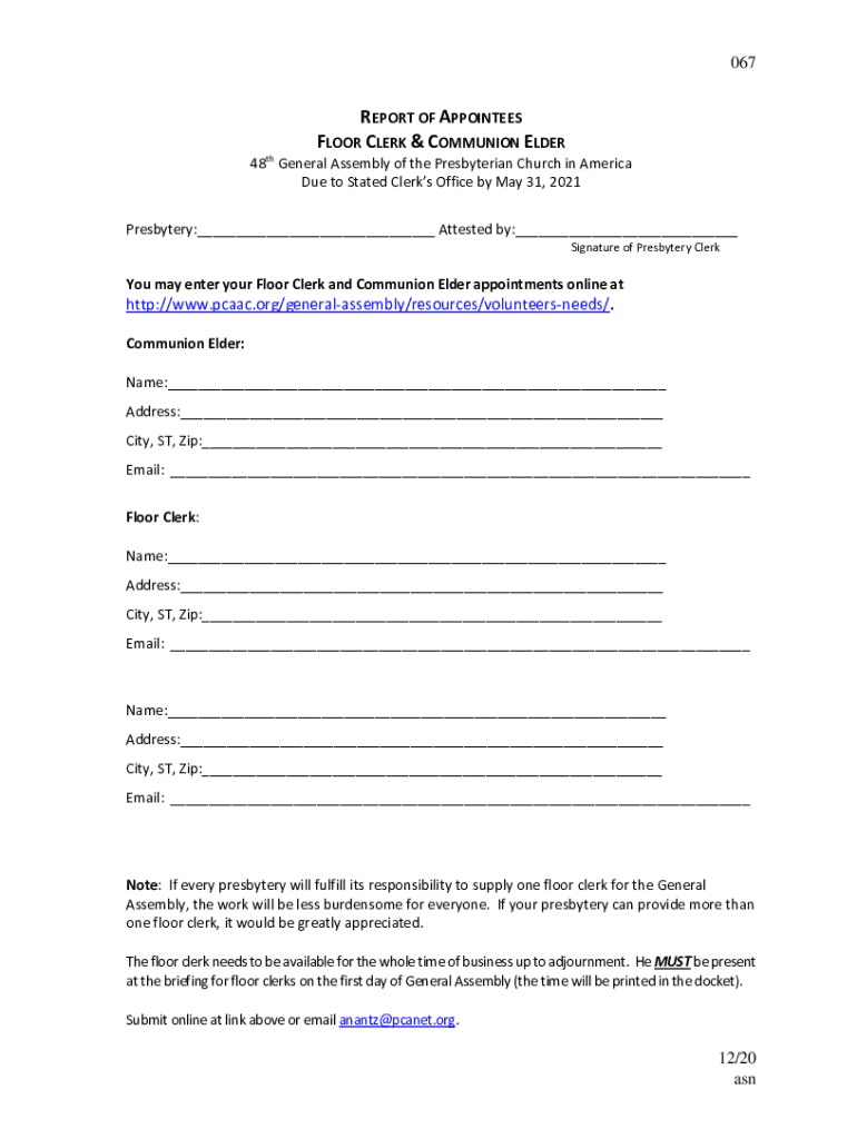 067REPORT OF APPOINTEES FLOOR CLERK & COMMUNION ELDER 48th General Assembly of the Presbyterian Church in America Due to Stated Clerks Office by May 31, 2021, Presbytery:___ Attested by:___ Signature