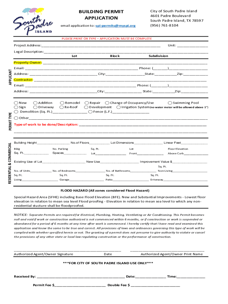 BUILDING PERMIT APPLICATION email application to: spipermits@myspi.orgCity of South Padre Island 4601 Padre Boulevard South Padre Island, TX 78597 (956) 7618104PLEASE PRINT OR TYPE APPLICATION MUST