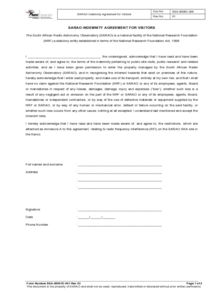 Get the free NRF/SARAO Indemnity Agreement For Visitors Over 18 Years ...