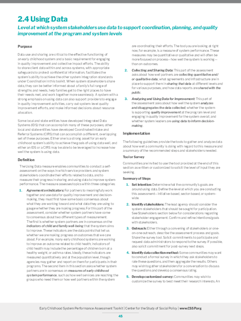 2.4 Using Data Level at which system stakeholders use data to support coordination, planning, and quality improvement at the program and system levels are coordinating their efforts. The tool you