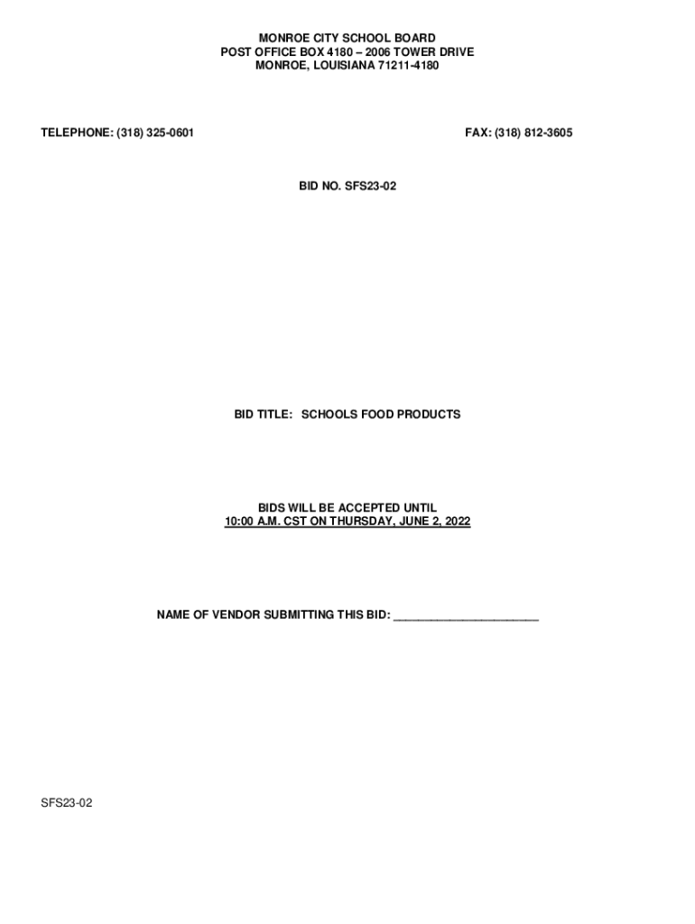 MONROE CITY SCHOOL BOARD POST OFFICE BOX 4180 2006 TOWER DRIVE MONROE, LOUISIANA 712114180TELEPHONE: (318) 3250601FAX: (318) 8123605BID NO. SFS2302BID TITLE: SCHOOLS FOOD PRODUCTSBIDS WILL BE ACCEPTED