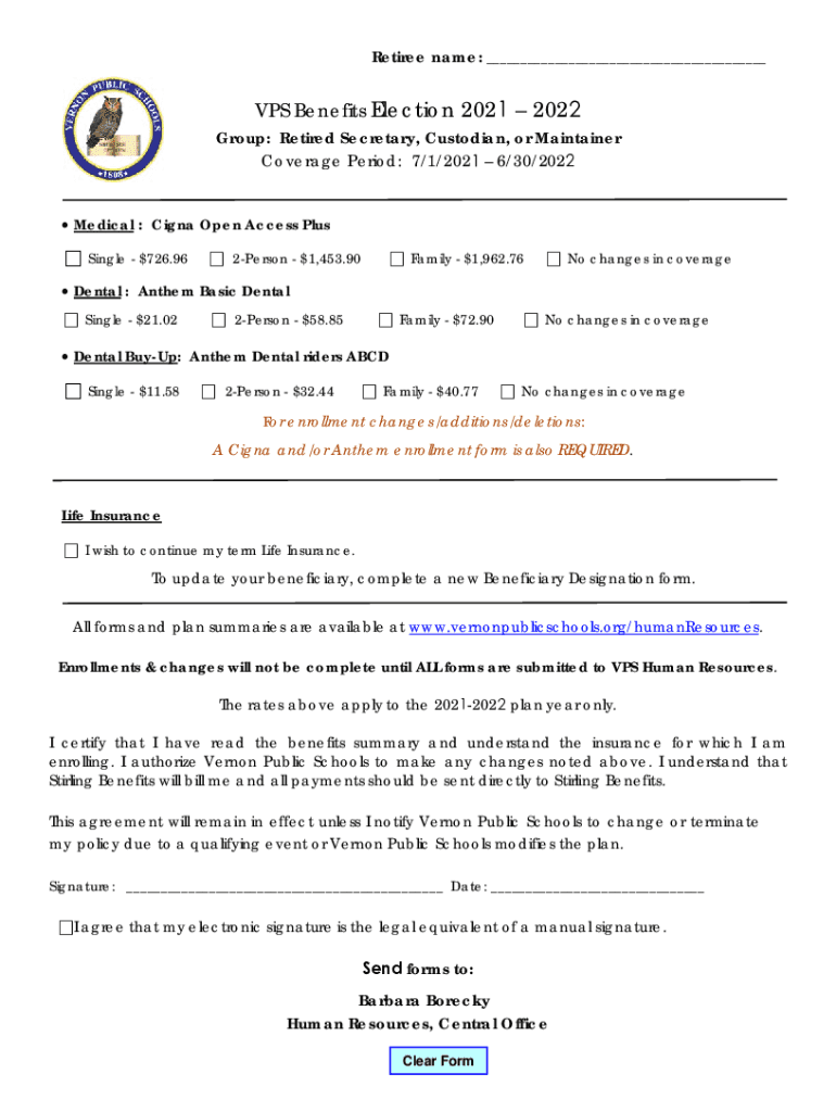 Retiree name: ___VPS Benefits Election 2021 2022 Group: Retired Secretary, Custodian, or Maintainer Coverage Period: 7/1/2021 6/30/2022 Medical : Cagney Open Access Plus Single $726.96 2Person $1,453.90