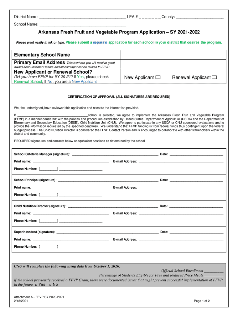 District Name: ___ LEA # _ _ _ _ _ _ _ County: ___ School Name: ___Arkansas Fresh Fruit and Vegetable Program Application SY 20212022 Please print neatly in ink or type. Please submit a separate application