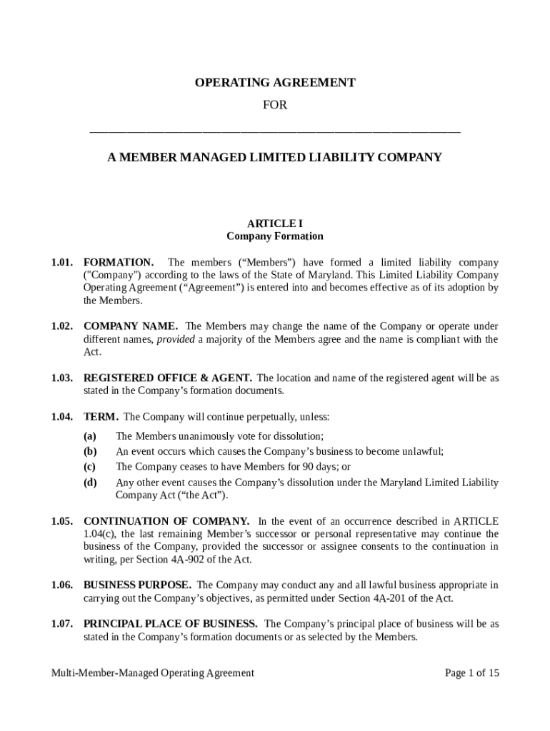 OPERATING AGREEMENT FOR ___ A MEMBER MANAGED LIMITED LIABILITY COMPANYARTICLE I Company Formation 1.01.FORMATION. The members (Members) have formed a limited liability company (\” Company\”) according