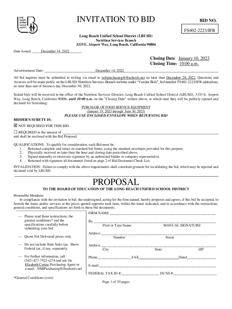 INVITATION TO BID NO. FS4022223/Lifelong Beach Unified School District (LB USD) Nutrition Services Branch 3333 E. Airport Way, Long Beach, California 90806 Date Issued:December 14, 2022Closing Date