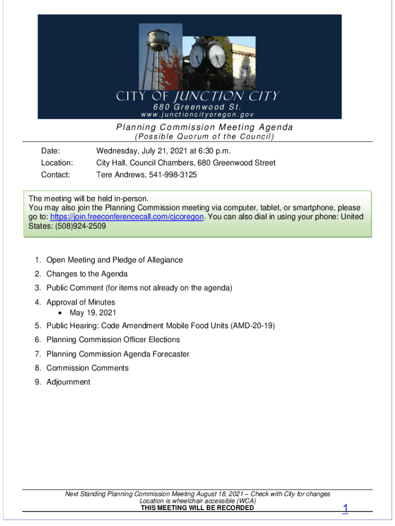 City of Junction City 680 Greenwood St.www.junctioncityoregon.govPlanning Commission Meeting Agenda (Possible Quorum of the Council)Date:Wednesday, July 21, 2021, at 6:30 p.m. Location: Contact:City
