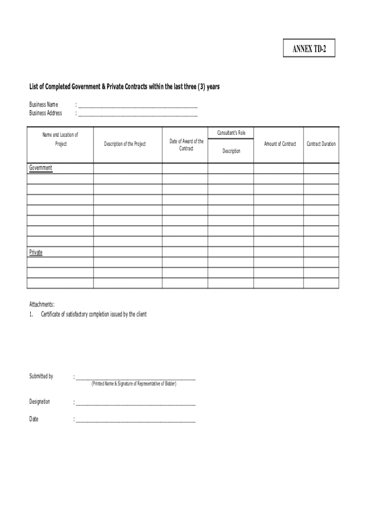 ANNEX TD2List of Completed Government & Private Contracts within the last three (3) years Business Name Business Address: ___ : ___Name and Location of ProjectConsultants Role Description of the Projectile