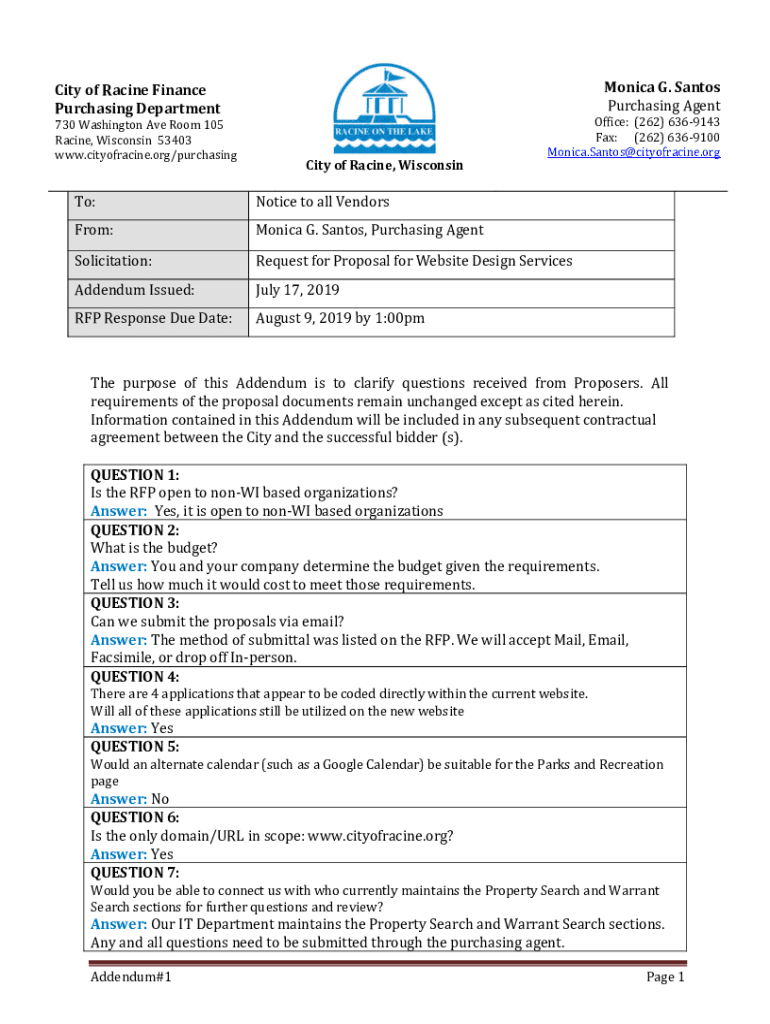 Monica G. Santos Purchasing Agency of Racine Finance Purchasing Department730 Washington Ave Room 105 Racine, Wisconsin 53403 www.cityofracine.org/purchasingCity of Racine, WisconsinOffice: (262)