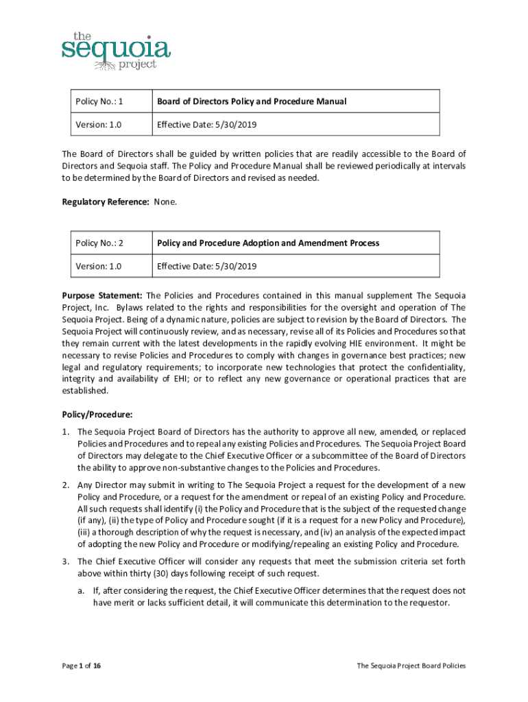 Policy No.: 1Board of Directors Policy and Procedure ManualVersion: 1.0Effective Date: 5/30/2019The Board of Directors shall be guided by written policies that are readily accessible to the Board