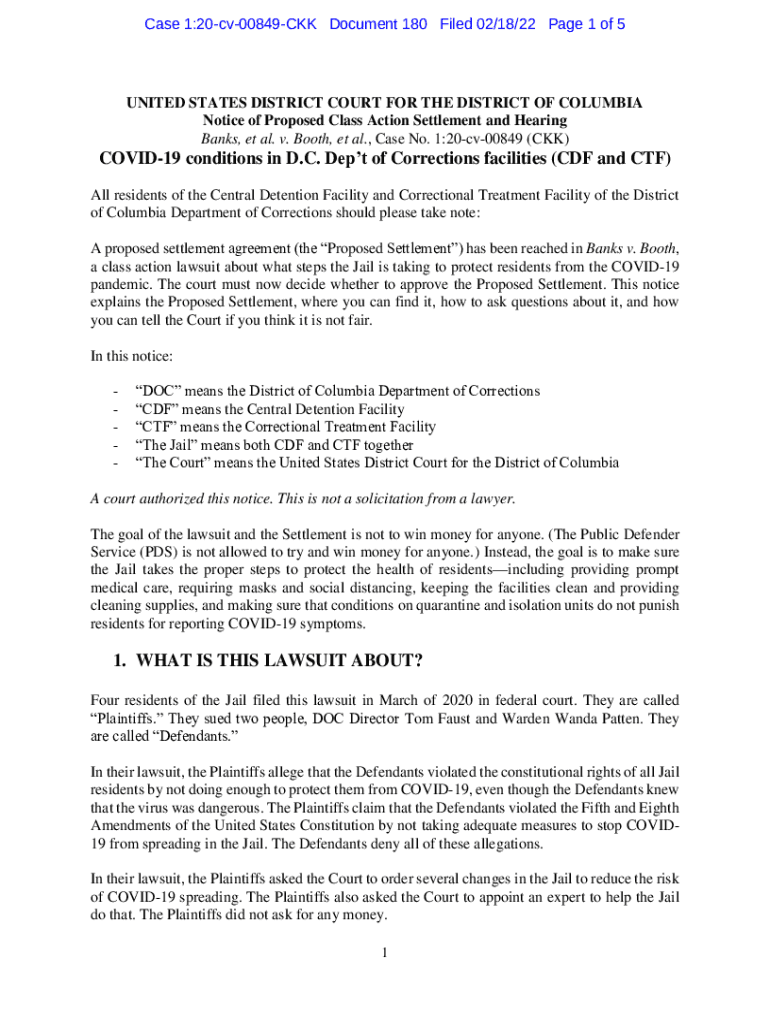 Case 1:20cv00849CKK Document 180 Filed 02/18/22-Page 1 of 5UNITED STATES DISTRICT COURT FOR THE DISTRICT OF COLUMBIA Notice of Proposed Class Action Settlement and Hearing Banks, et al. v. Booth,
