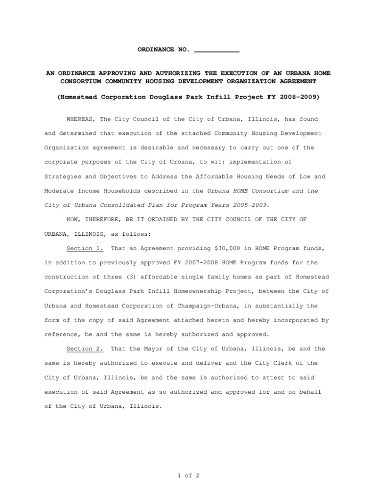 ORDINANCE NO. ___AN ORDINANCE APPROVING AND AUTHORIZING THE EXECUTION OF AN URBANA HOME CONSORTIUM COMMUNITY HOUSING DEVELOPMENT ORGANIZATION AGREEMENT (Homestead Corporation Douglass Park Infill