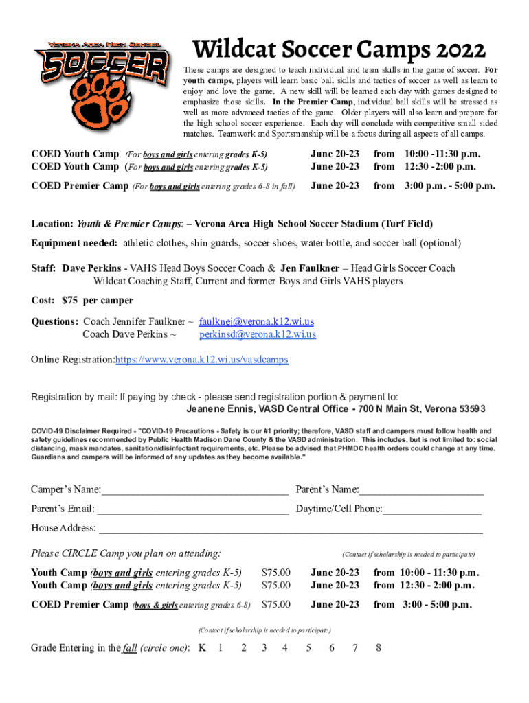 Wildcat Soccer Camps 2022These camps are designed to teach individual and team skills in the game of soccer. For youth camps, players will learn basic ball skills and tactics of soccer as well as