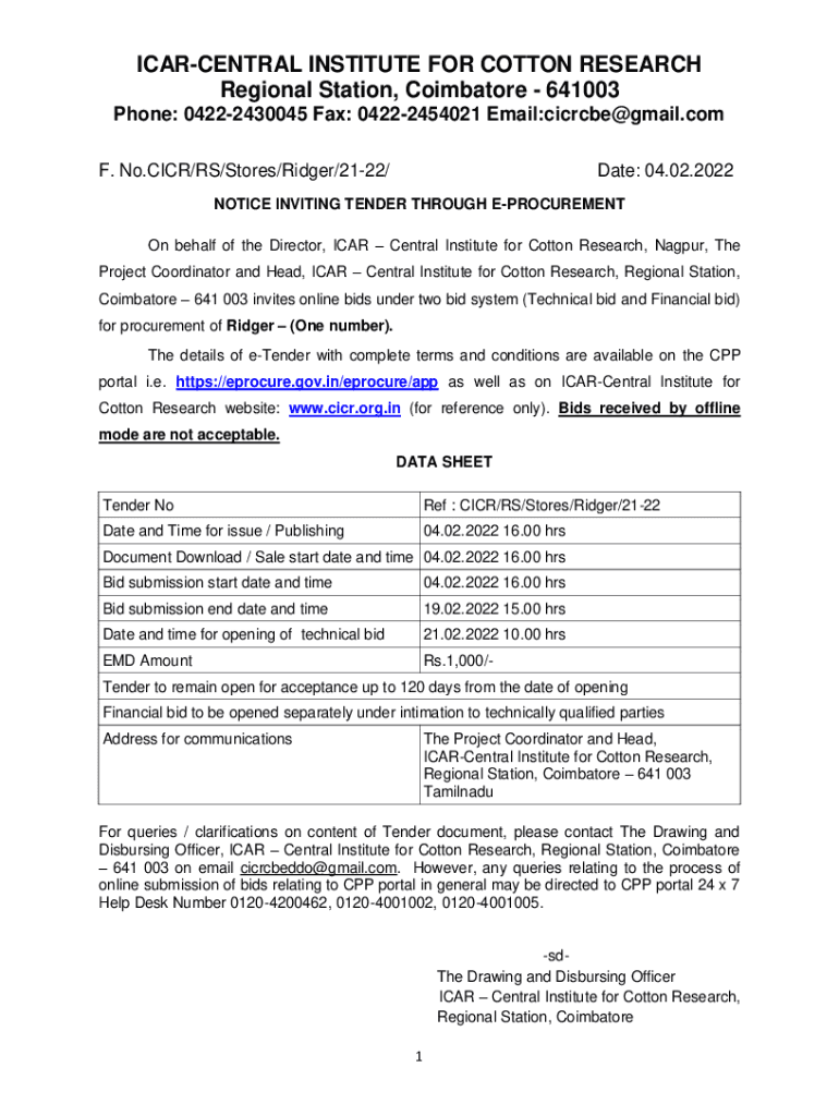 PARACENTRAL INSTITUTE FOR COTTON RESEARCH Regional Station, Coimbatore 641003 Phone: 04222430045 Fax: 04222454021 Email:cicrcbe@gmail.com F. No.CICR/RS/Stores/Ridger/2122/Date: 04.02.2022NOTICE INVITING
