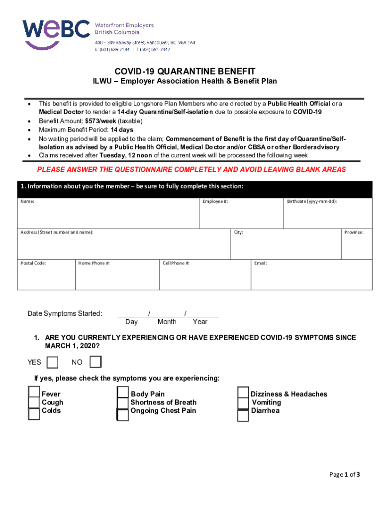 COVID-19 QUARANTINE BENEFITING Employer Association Health & Benefit Plan This benefit is provided to eligible Alongshore Plan Members who are directed by a Public Health Official or a Medical Doctor