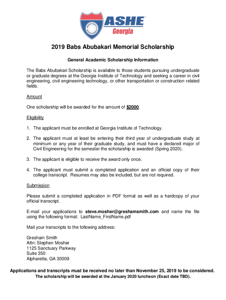 2019 Bass Abubakar Memorial Scholarship General Academic Scholarship Information The Bass Abubakar Scholarship is available to those students pursuing undergraduate or graduate degrees at the Georgia