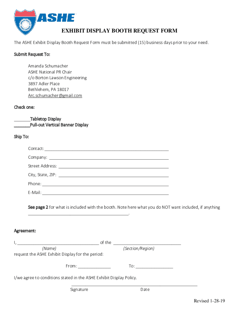 EXHIBIT DISPLAY BOOTH REQUEST From The ASHE Exhibit Display Booth Request Form must be submitted (15) business days prior to your need. Submit Request To: Amanda Schumacher ASHE National PR Chair