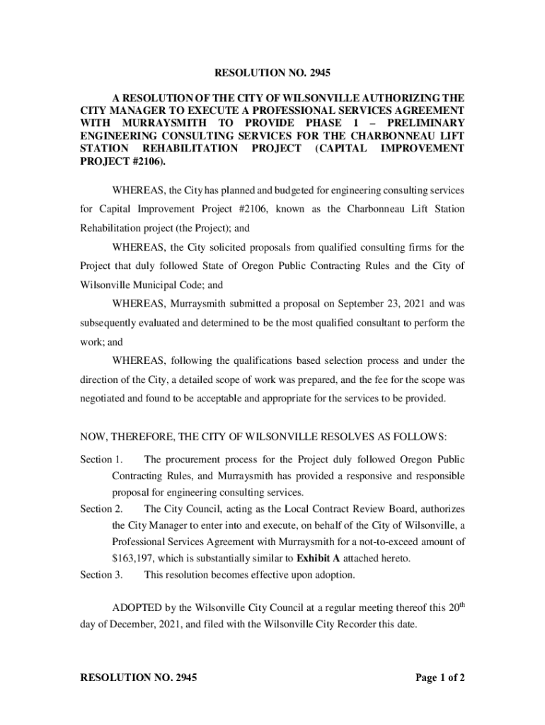 RESOLUTION NO. 2945 A RESOLUTION OF THE CITY OF WILSONVILLE AUTHORIZING THE CITY MANAGER TO EXECUTE A PROFESSIONAL SERVICES AGREEMENT WITH MURRAYSMITH TO PROVIDE PHASE 1 PRELIMINARY ENGINEERING CONSULTING