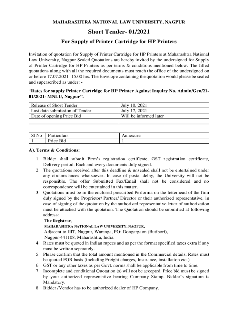 MAHARASHTRA NATIONAL LAW UNIVERSITY, NAGPURShort Tender 01/2021 For Supply of Printer Cartridge for HP Printers Invitation of quotation for Supply of Printer Cartridge for HP Printers at Maharashtra