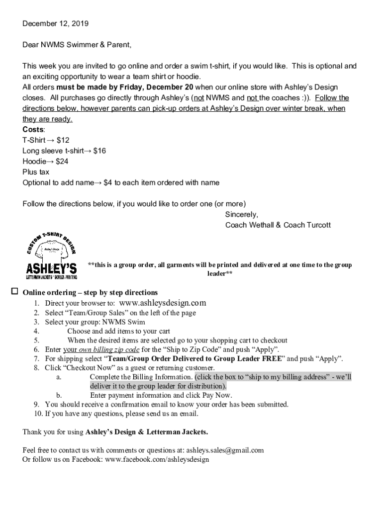 December 12, 2019, Dear WMS Swimmer & Parent, This week you are invited to go online and order a swim shirt, if you would like. This is optional and an exciting opportunity to wear a team shirt or