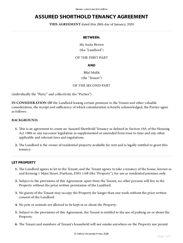 Began, Land Law 2nd editionASSURED SHORTHAND TENANCY AGREEMENT THIS AGREEMENT dated this 28th day of January 2020 BETWEEN: Ms Anita Brown (the \” Landlord\”) OF THE FIRST PART AND Bilal Malik
