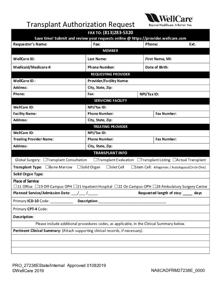 The transplant authorization request must be completed with the patient's personal information, medical history, and details of the transplant procedure.