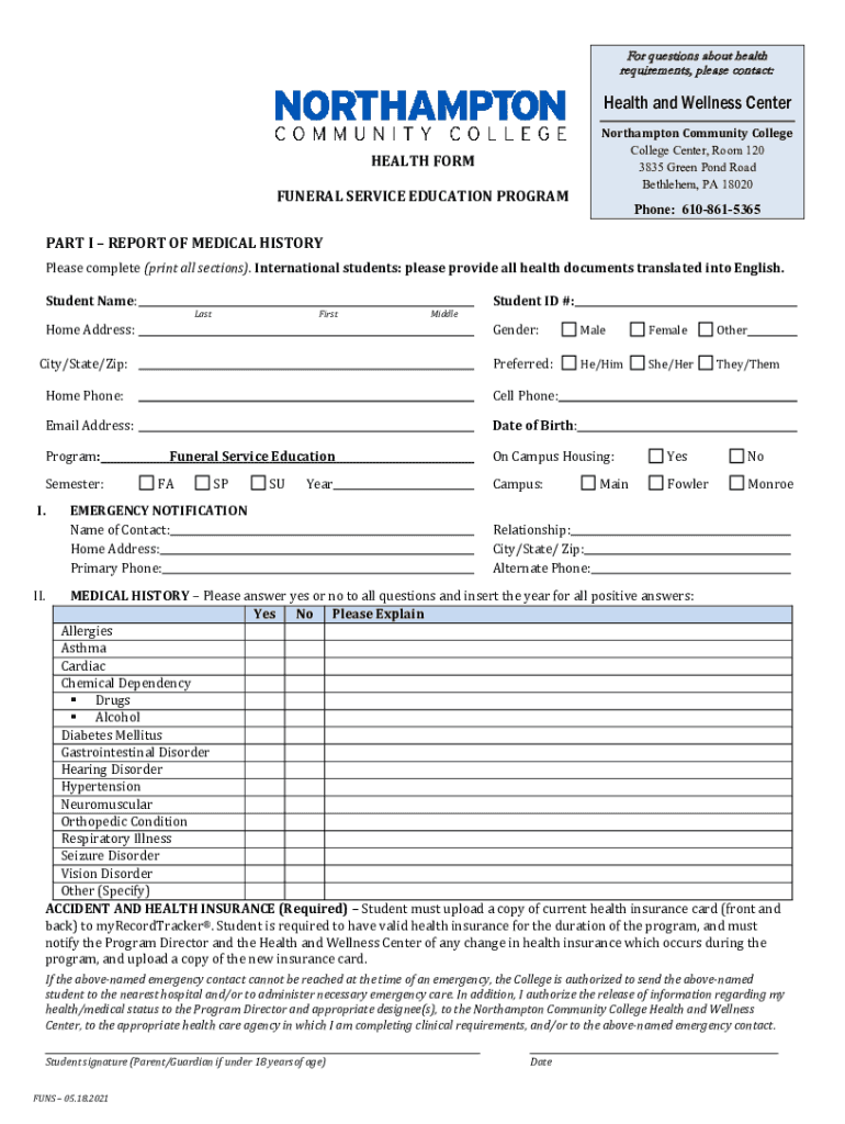 For questions about health requirements, please contact:Health and Wellness Center Northampton Community College Center, Room 120 3835 Green Pond Road Bethlehem, PA 18020HEALTH FORM FUNERAL SERVICE