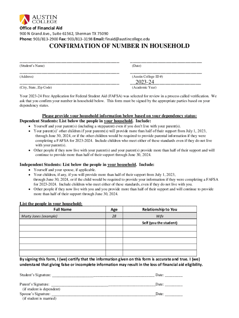 Office of Financial Aid 900 N Grand Ave., Suite 61562, Sherman TX 75090 Phone: 903/8132900 Fax: 903/8133198 Email: finaid@austincollege.eduCONFIRMATION OF NUMBER IN HOUSEHOLD ___ (Students Name)___