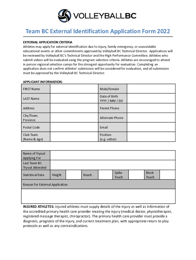 Team BC External Identification Application Form 2022 EXTERNAL APPLICATION CRITERIA Athletes may apply for external identification due to injury, family emergency, or unavoidable educational events