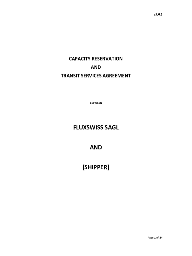 V5.0.2CAPACITY RESERVATION AND TRANSIT SERVICES AGREEMENTBETWEENFLUXSWISS SAIL AND [SHIPPER]Page 1 of 34Capacity Reservation and Transit Services Agreement This Capacity Reservation and Transit Services