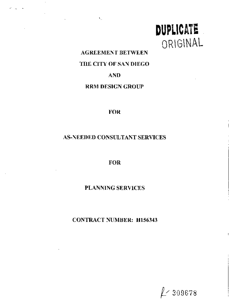 DUPLICATE ORG NAL AGREEMENT BETWEEN Tile CITY OF SAN DIEGO AND ARM DESIGN GROUPFORASNEEDED CONSULTANT SERVICESFORPLANNING SERVICESCONTRACT NUMBER: H156343f: 309678AGREEMENT FOR NEEDED CONSULTANT SERVICES