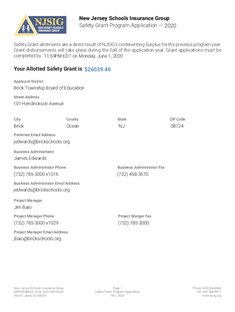 New Jersey Schools Insurance Group Safety Grant Program Application YYY 2020 Safety Grant allotments are a direct result of Jigs Underwriting Surplus for the previous program year. Grant disbursements
