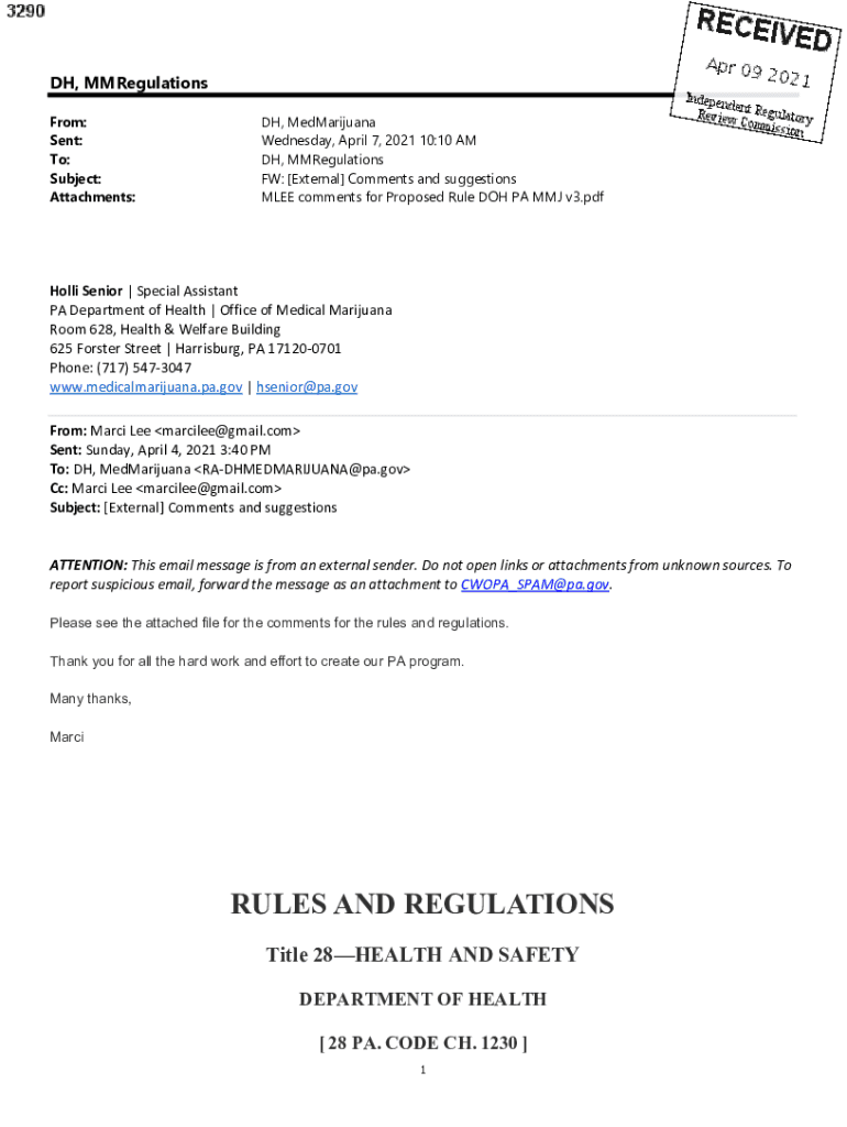 DH, Regulations From: Sent: To: Subject: Attachments:DH, Marijuana Wednesday, April 7, 2021 10:10 AM DH, Regulations FW: [External] Comments and suggestions LEE comments for Proposed Rule DOH PA MM
