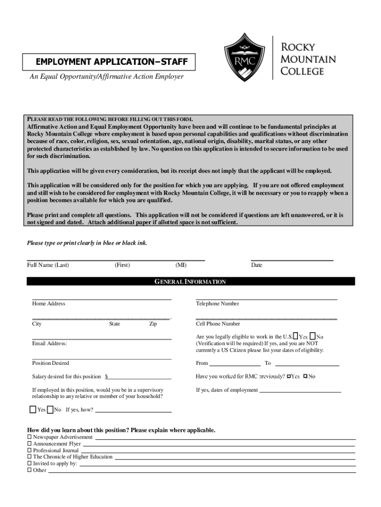 EMPLOYMENT APPLICATIONSTAFF An Equal Opportunity/Affirmative Action EmployerPLEASE READ THE FOLLOWING BEFORE FILLING OUT THIS FORM. Affirmative Action and Equal Employment Opportunity have been and