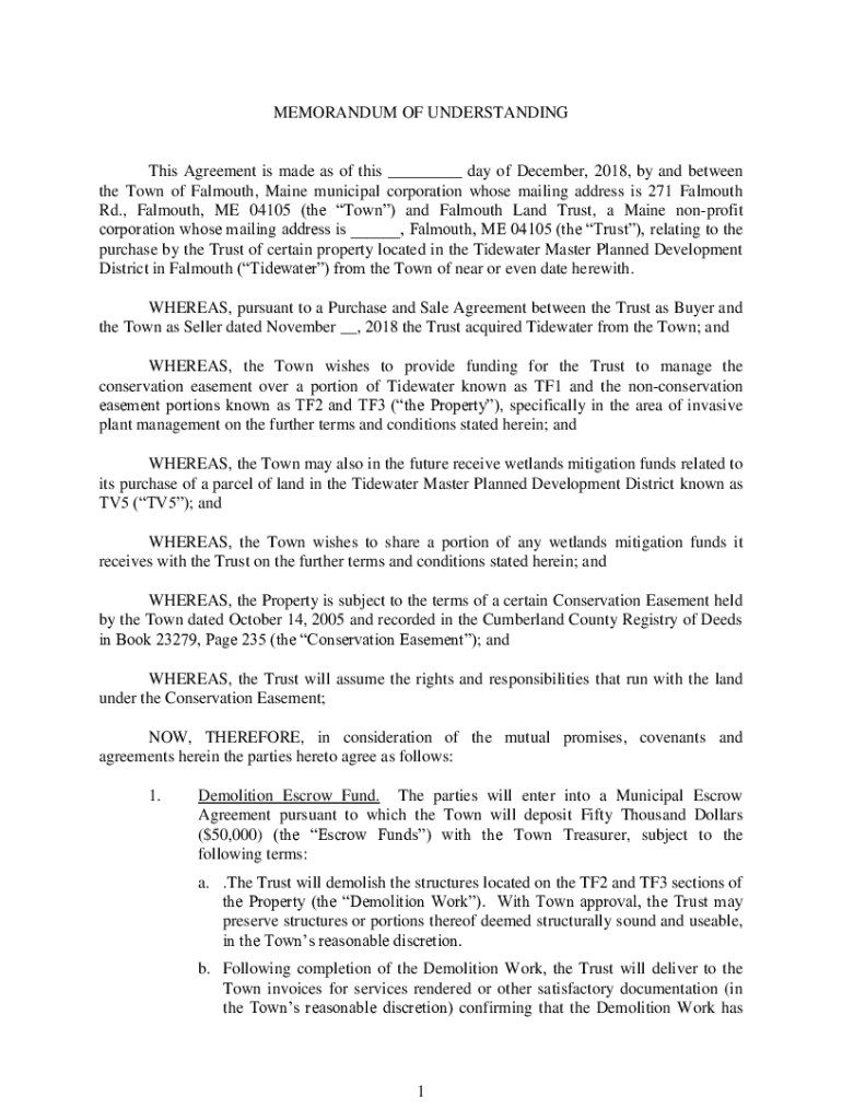 MEMORANDUM OF Understandings Agreement is made as of this ___ day of December 2018, by and between the Town of Falmouth, Maine municipal corporation whose mailing address is 271 Falmouth Rd., Falmouth,
