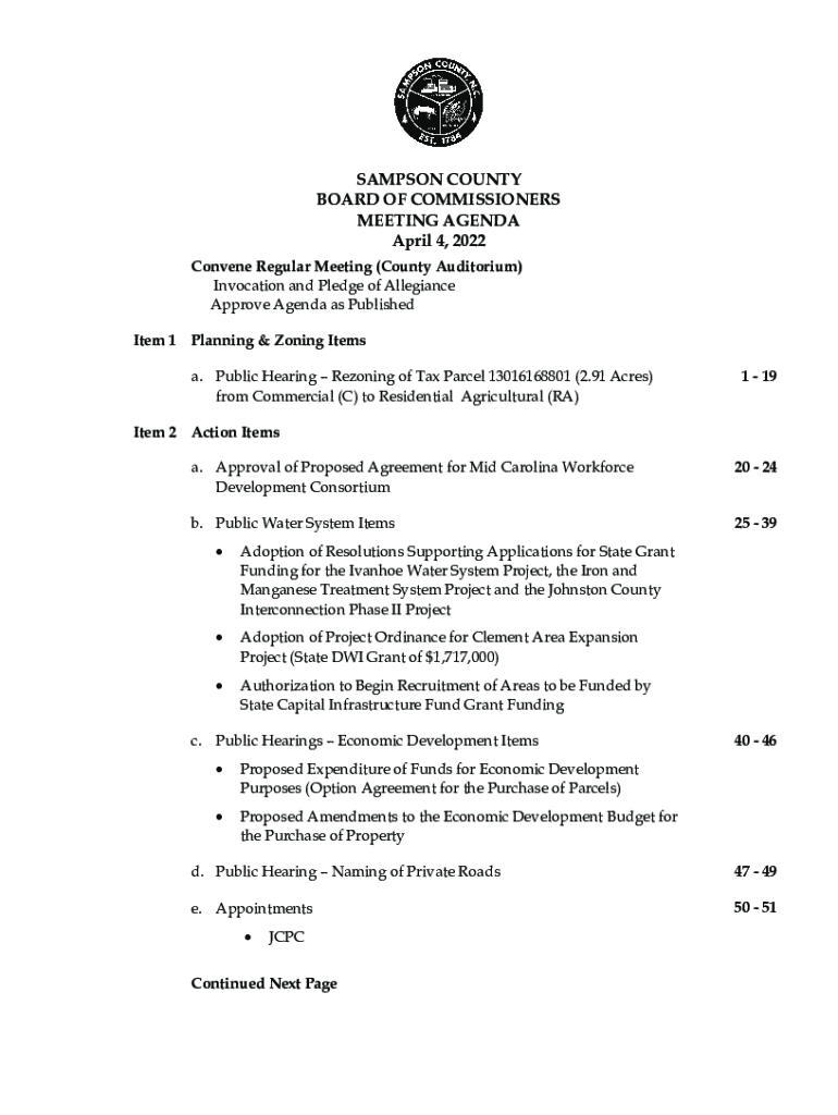 SAMPSON COUNTY BOARD OF COMMISSIONERS MEETING AGENDA April 4, 2022, Convene Regular Meeting (County Auditorium) Invocation and Pledge of Allegiance Approve Agenda as Published Item 1 Planning & Zoning